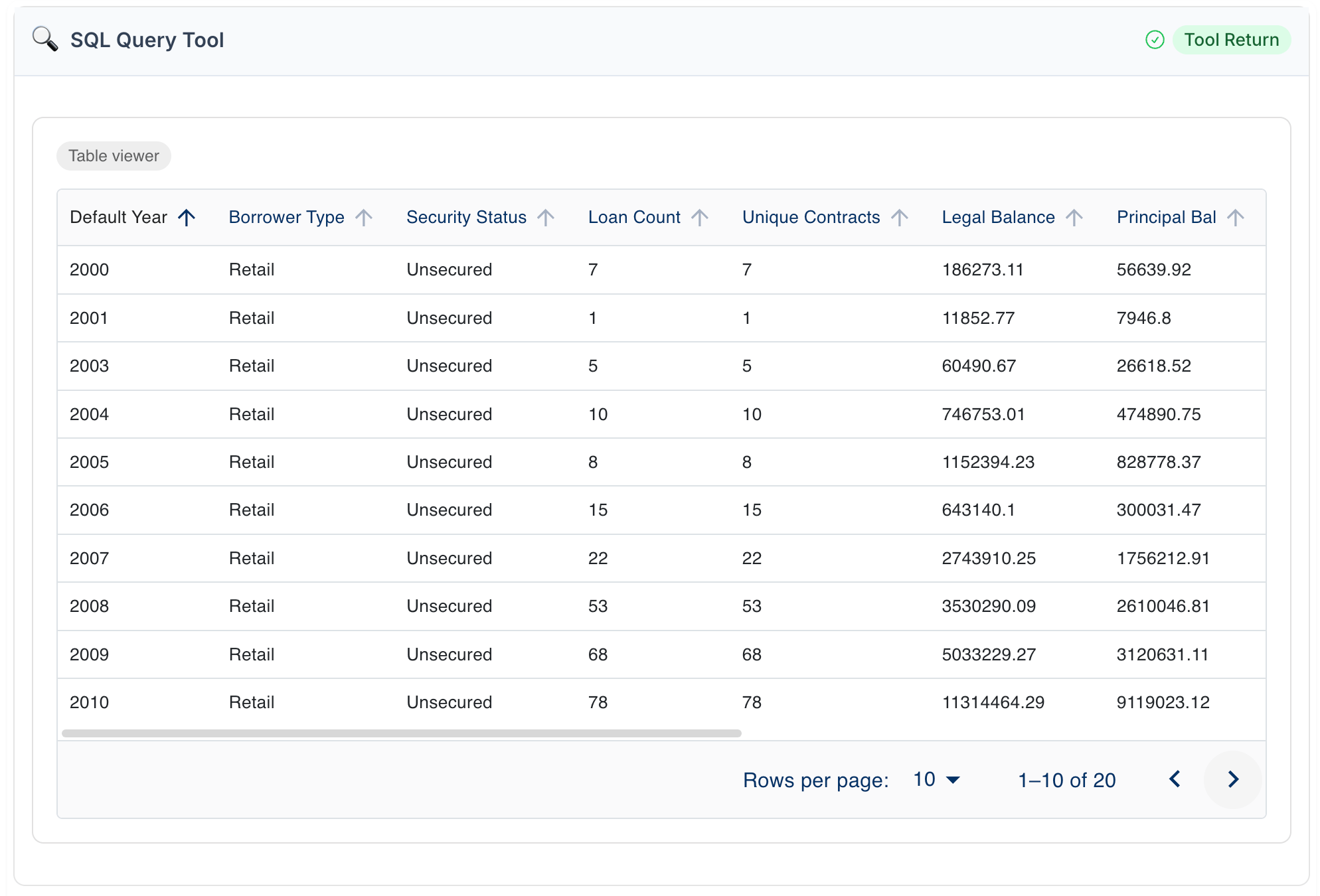 The agent delivers insights through interactive dashboards, stratification tables, and financial product. Users can quickly visualise exposures, risk trends, covenant breaches, and performance metrics across portfolios.